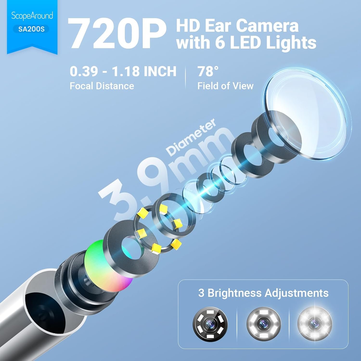 - Precision Viewing: Equipped with a 3.9mm ultra-thin lens and HD resolution, our otoscope with light provides crystal-clear images. 6 adjustable LED lights and 3 brightness settings ensure optimal visibility for every inspection \\n